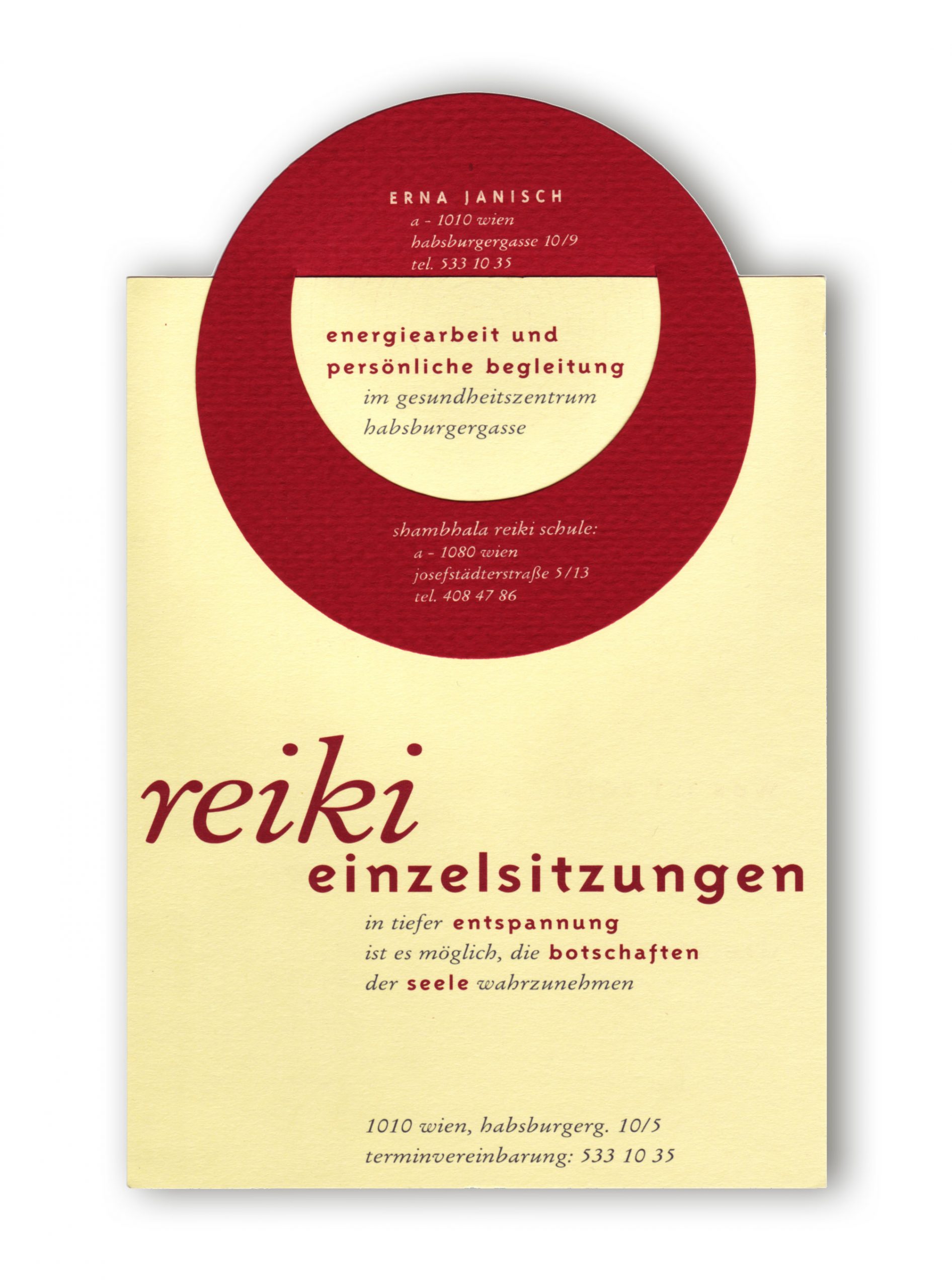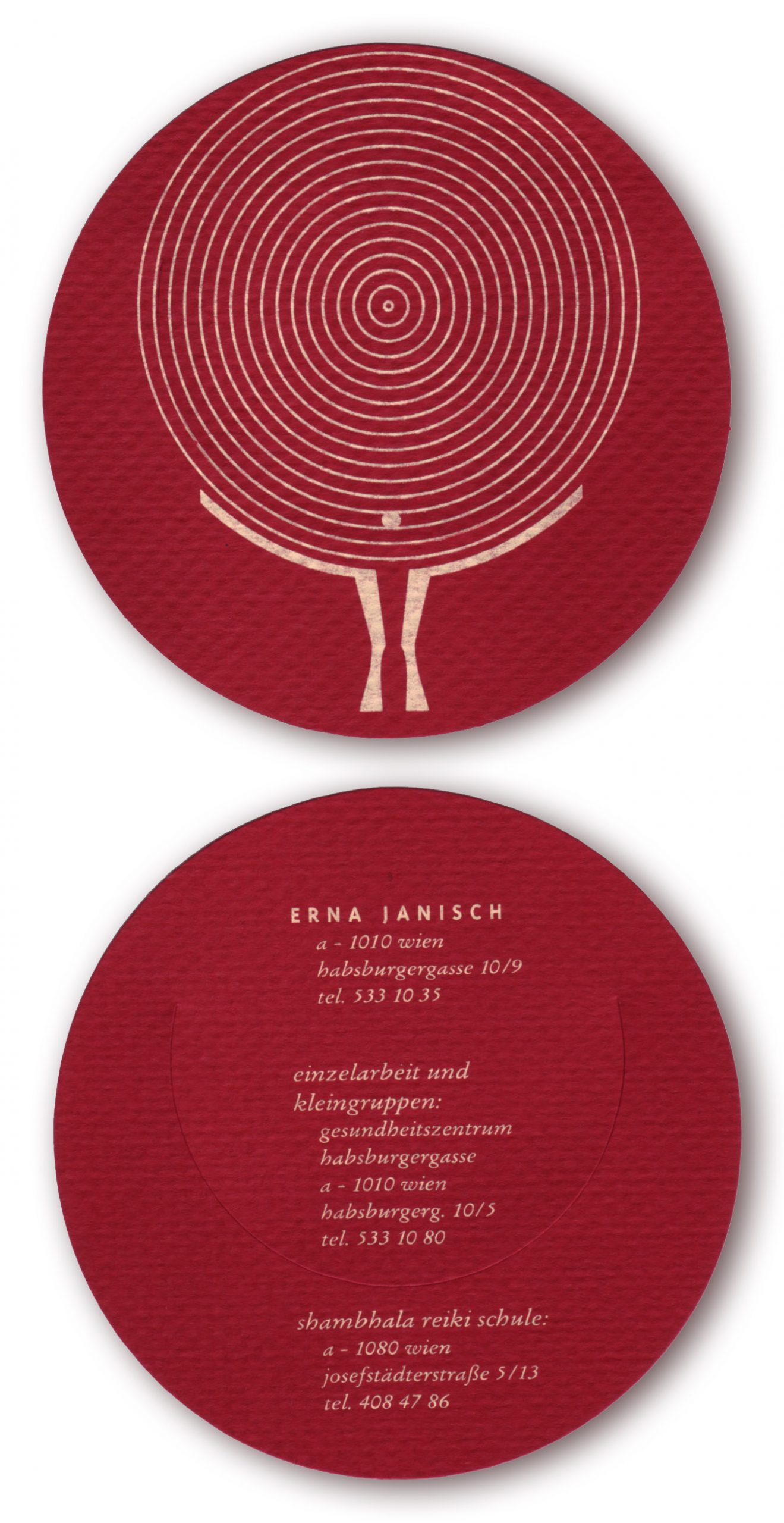 Prospekt: Umschlag hochwertiges Kaschmir Papier mit Siebdruck, Visitenkarte rund: als Lesezeichen verwendbar.